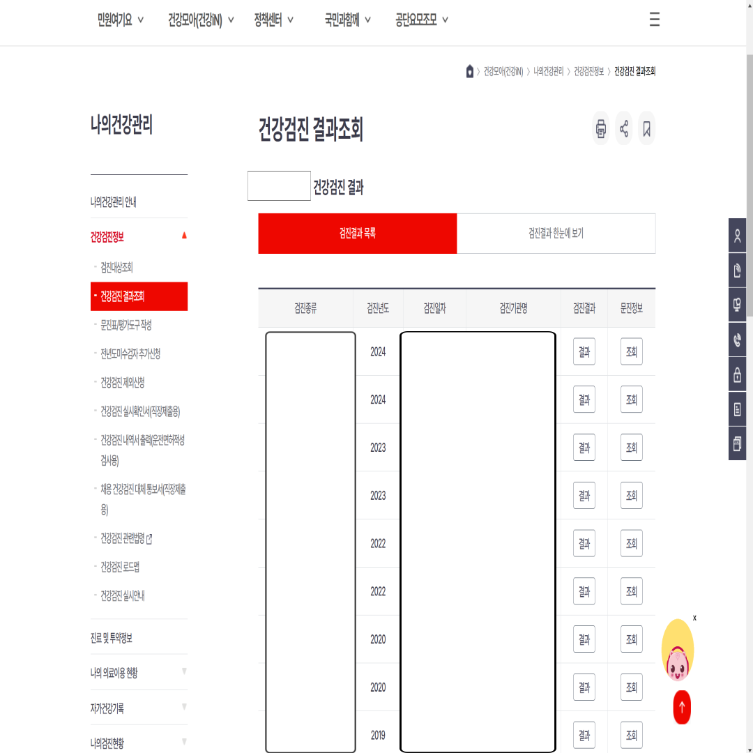 본인인증이 완료되면 과거부터 현재까지 연도별 건강검진 내역을 아래 사진과 같이 확인할 수 있습니다.