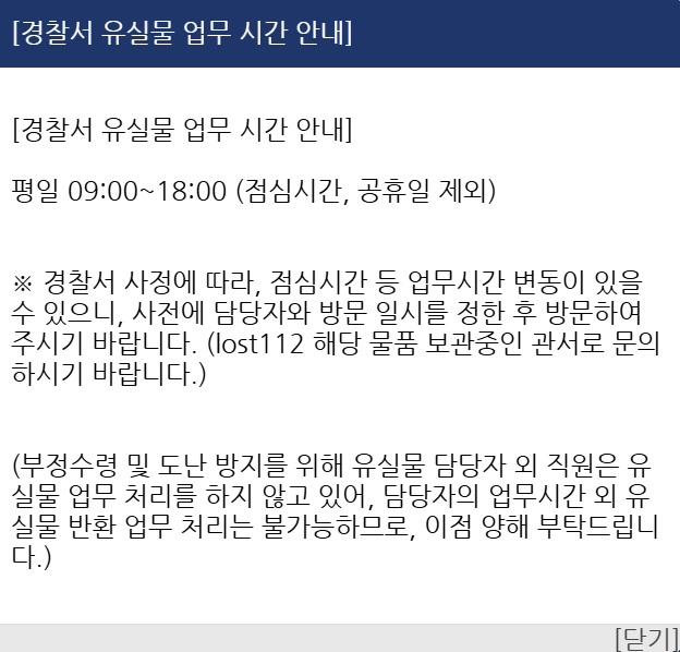 경찰서 유실물 업무 시간은 오전 09:00 ~ 오후 6시까지 라고 합니다. (점심시간, 공휴일 제외), 경찰서 사정에 따라 업무시간 변동이 있을 수 있으니 사전에 꼭 경찰서 담당자와 통화하시고 방문해주시기 바랍니다.