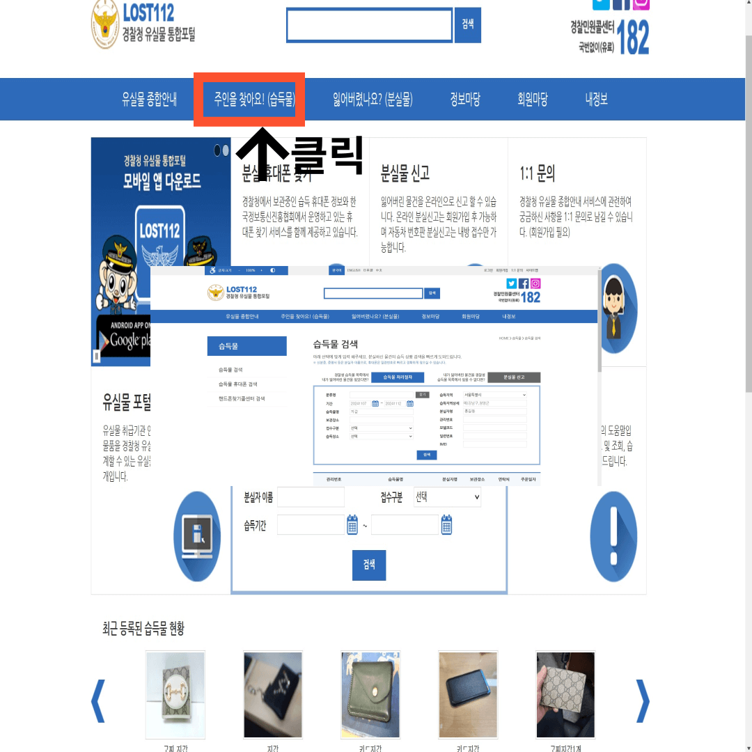 경찰청 유실물 종합관리시스템(LOST 112)은 전국의 경찰관서 뿐 아니라, 개별적으로 운영 중인 전국의 유실물운영기관의 유실물 정보를 통합하여 국민들에게 제공하는 대국민 통합포털 시스템입니다. 길거리 등에서 습득된 물건이 경찰관서 등에 신고되면 이 시스템에 등록되게 됩니다.