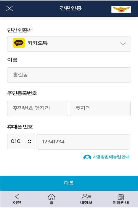 카카오톡 간편인증 실행화면입니다. 인적사항을 입력하고 인증을 진행합니다.
