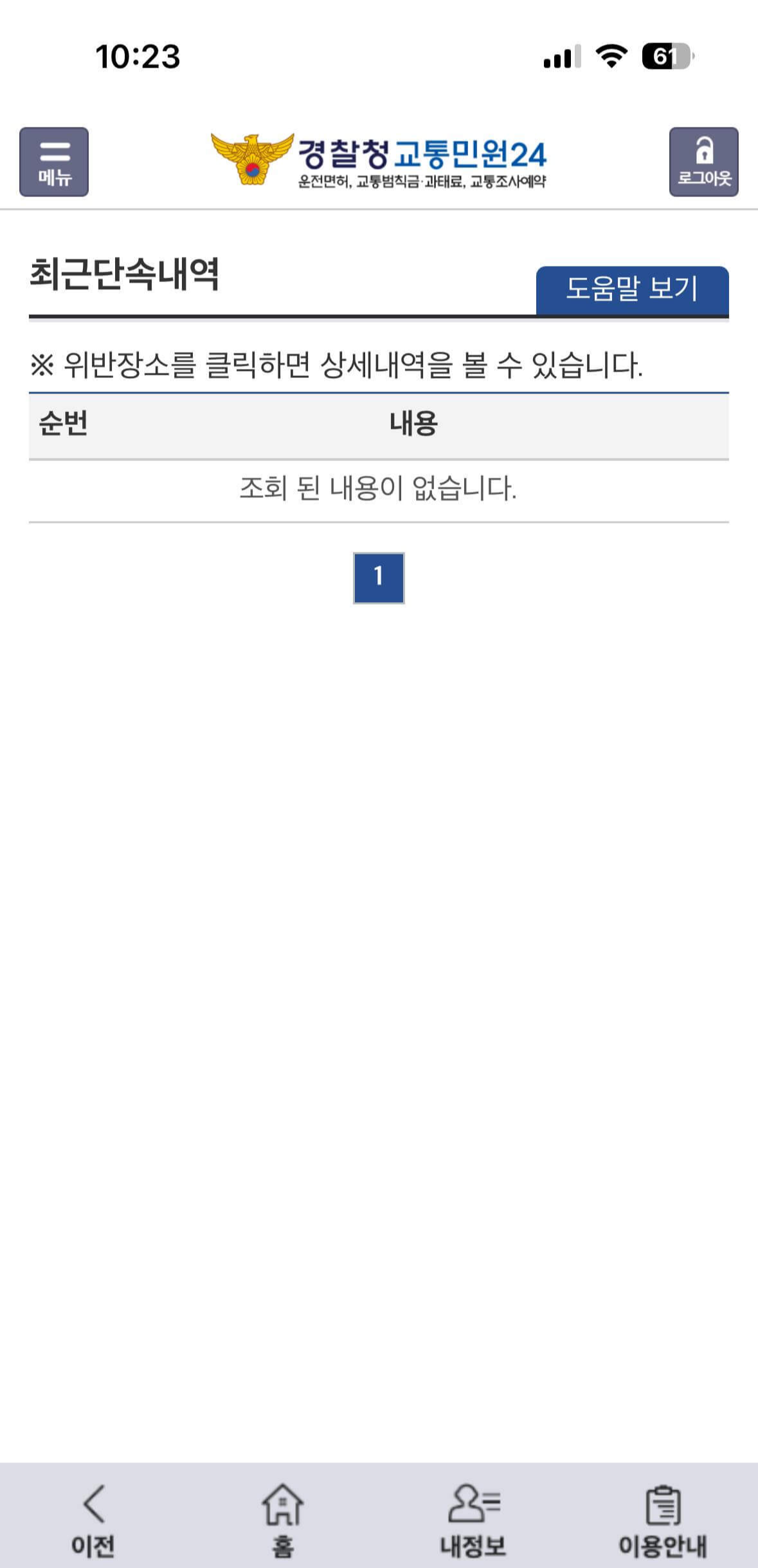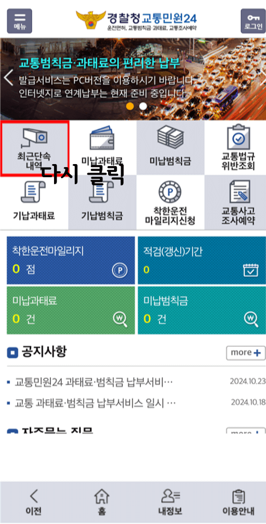 본인인증이 끝나면 <최근단속내역>을 다시 누릅니다. 그러면 최근에 단속된 내역이 조회됩니다. 단속 이후 보통 2~7일 정도면 최근 단속내역이 검색이 된다고 합니다.