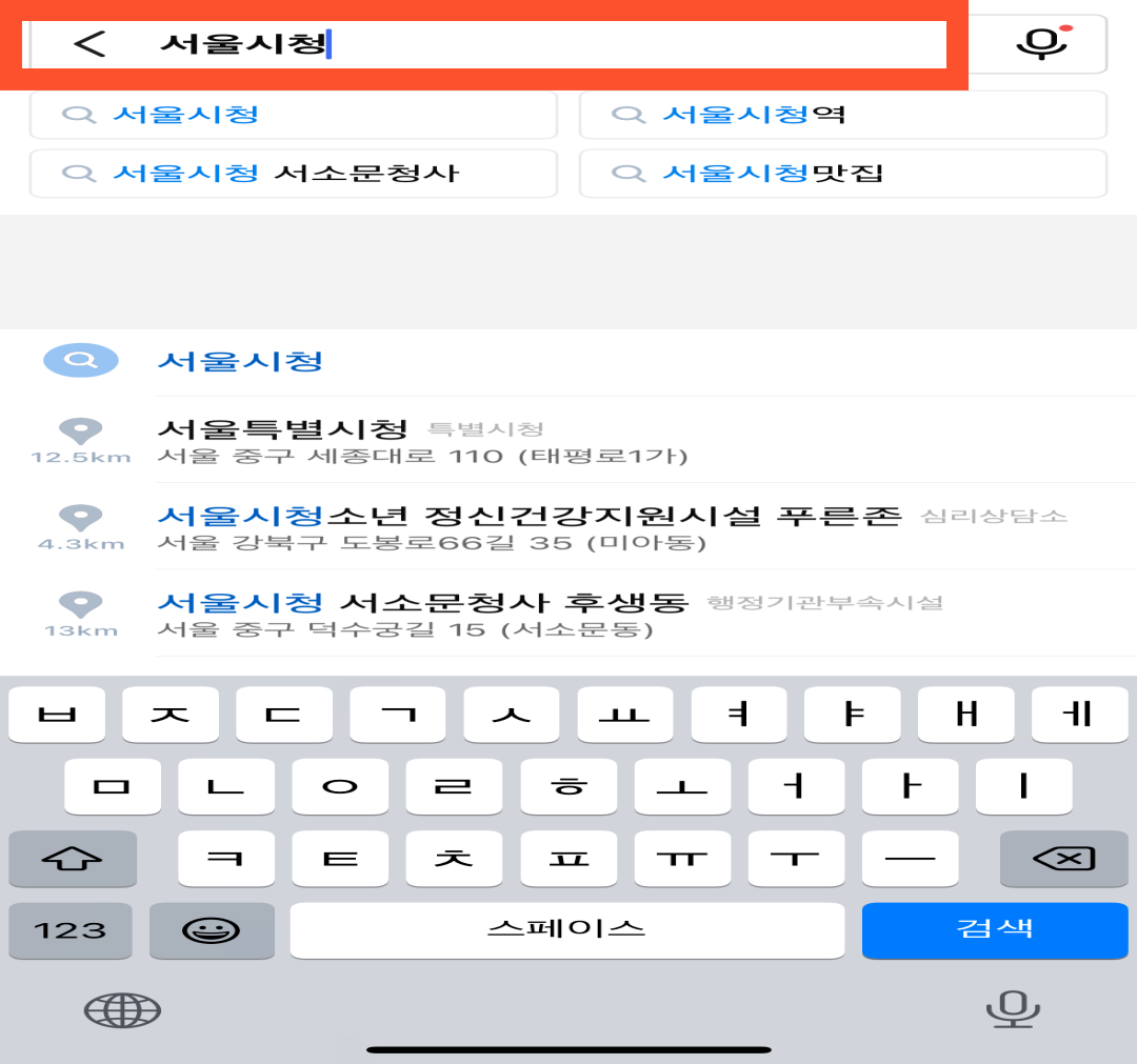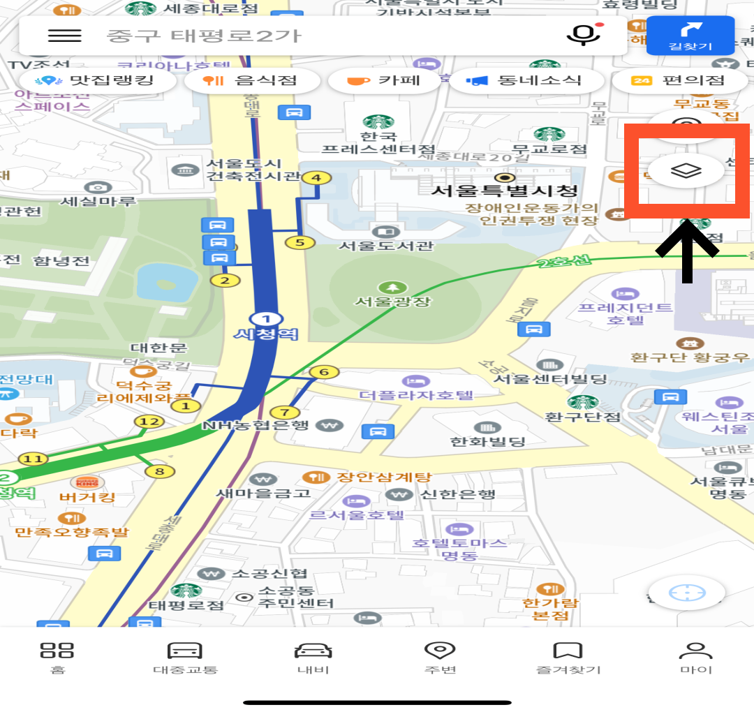 <카카오맵> 어플에서 빨간색으로 표시된 우측 상단 마름모 모양을 누릅니다.