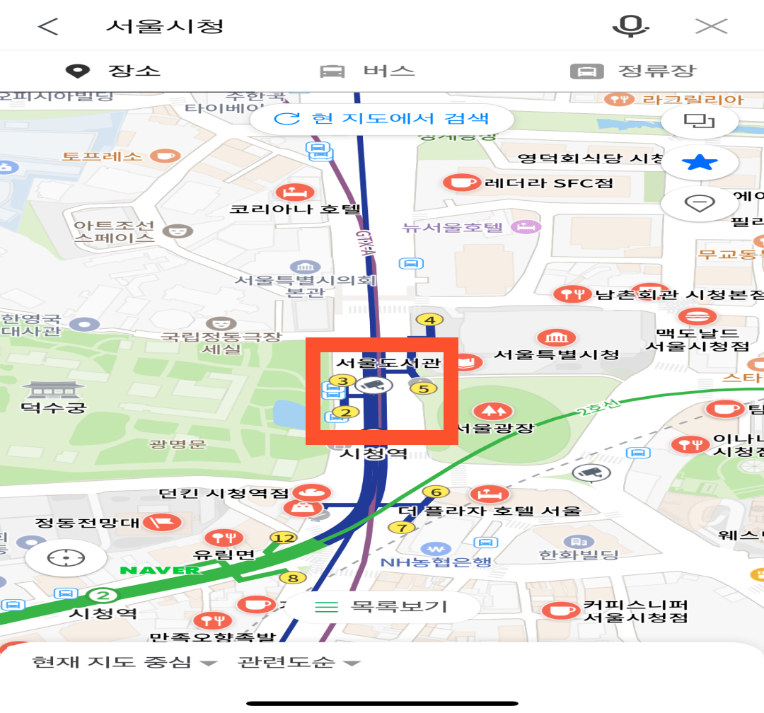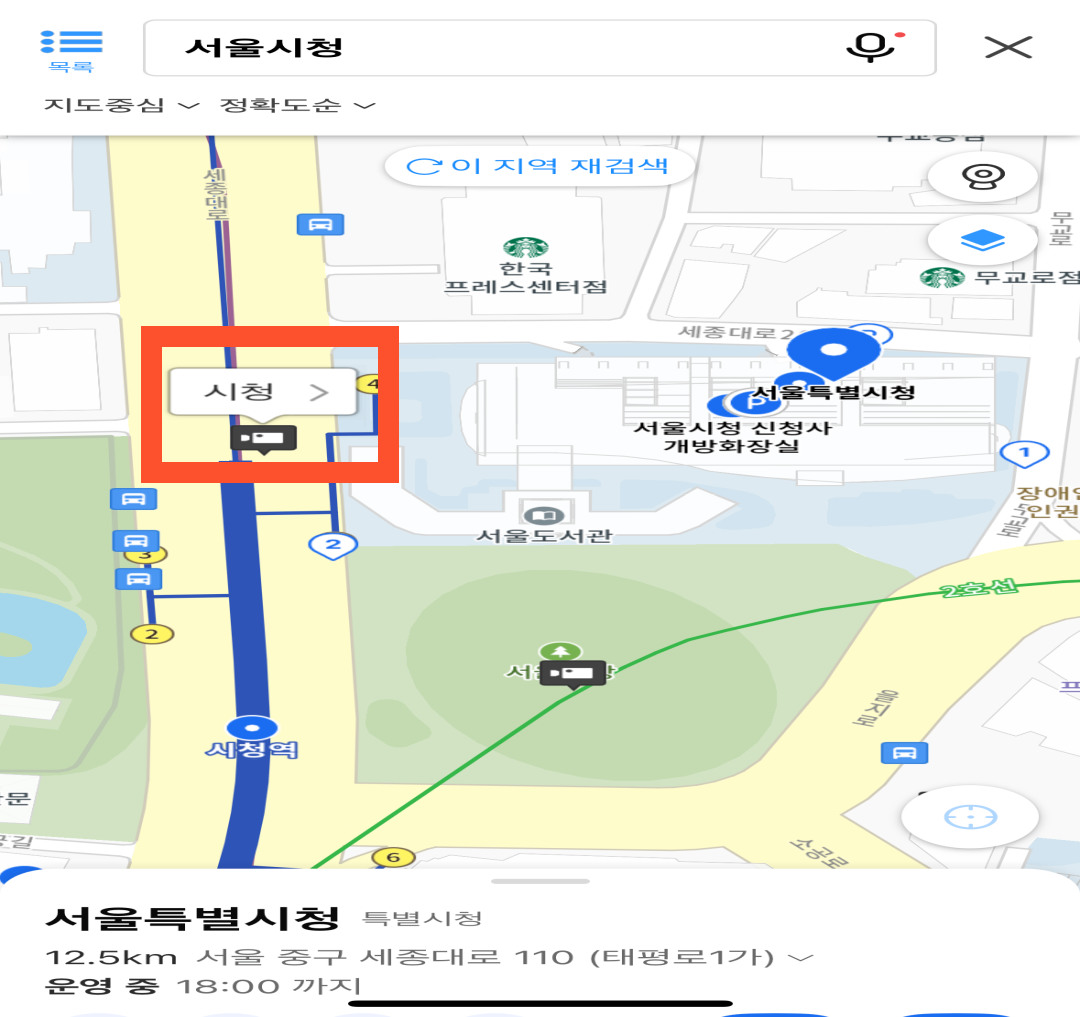 서울시청을 입력한 화면입니다. 지도 화면을 확대하거나 축소하여 원하는 cctv를 선택합니다. 예시로 시청역 5번출구앞에 있는 cctv 모양의 버튼을 눌러보겠습니다. CCTV를 선택하면 한글명칭이 나오는데 한글명칭을 다시 눌러주면 됩니다.