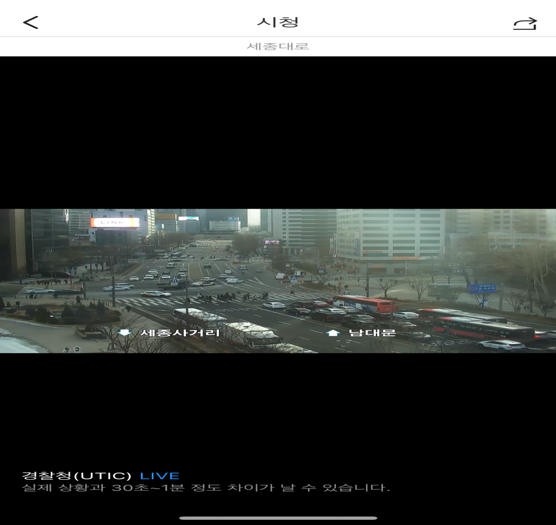 cctv 모양을 누르면 아래 사진과 같이 cctv 실시간 영상이 실행됩니다. 화면 확대도 가능하니 큰 화면으로 보시길 바라며 실제 상황과 30초~1분 정도 차이가 날 수 있다고 하니 참고하시기 바랍니다.