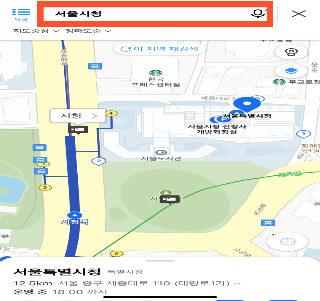 지도에 cctv 모양이 생겼는데요. 이어서 cctv를 확인하고 싶은 곳의 대표 건물이나 지하철역명 등을 입력합니다. 주소나 주요 도로명을 입력하셔도 좋고 대표건물이나 지하철역 이름으로 입력해도 괜찮습니다. 편의상 서울시청을 입력해 보도록 하겠습니다.