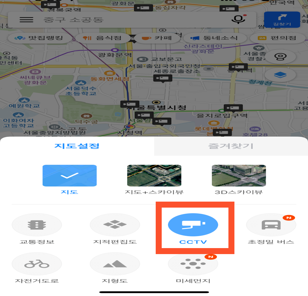 그러면 아래 사진과 같이 지도 설정화면이 등장하는데 여기서 cctv를 선택하고 다시 지도 화면으로 돌아갑니다.(지도화면 아무 곳이나 터치하면 지도로 돌아갑니다.)