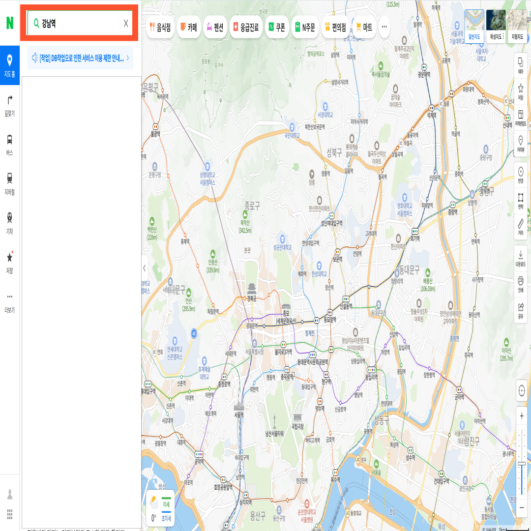 네이버 지도에서는 CCTV열람을 원하는 지역으로 먼저 이동해주는게 편합니다. 따라서 좌측 상단 빨간색으로 표시된 부분에 원하는 장소, 지하철명, 도로 등을 입력합니다. 편의상 강남역을 입력해보겠습니다.