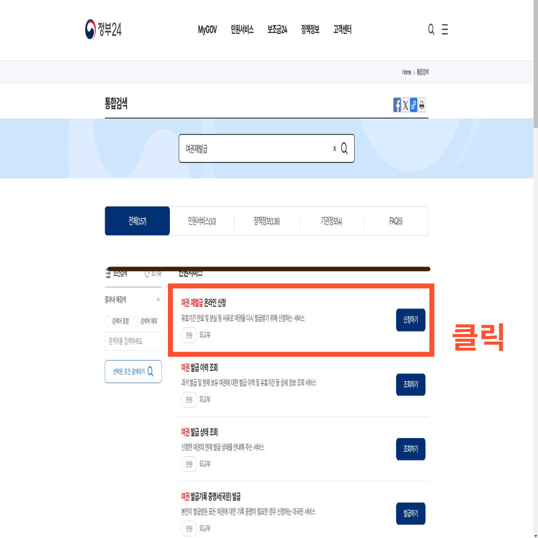 정부24 메인화면 중간에 여권재발급을 입력하고 클릭합니다.