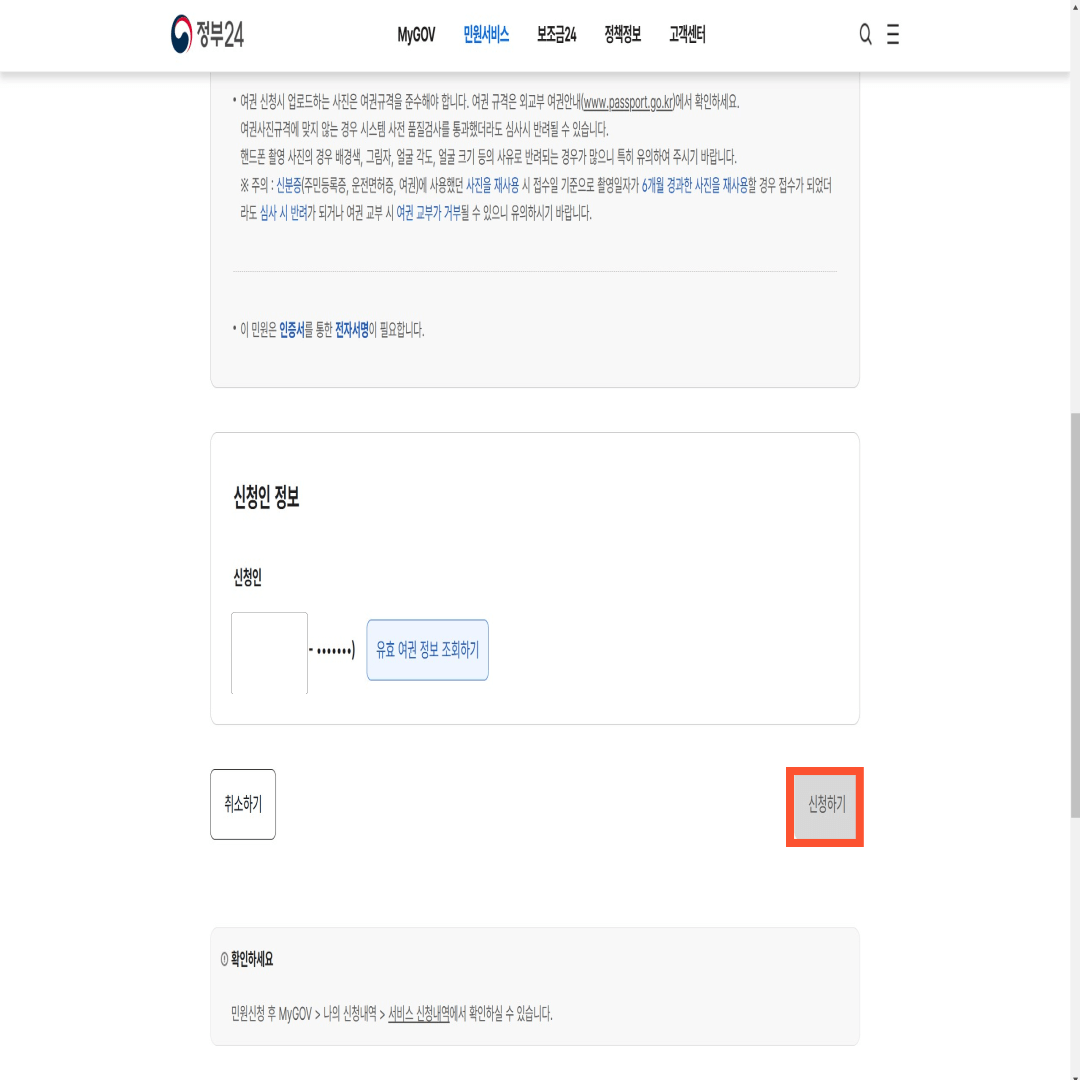 <시작하기 전에> 및 <신청인 정보>를 꼼꼼히 확인하고 [신청하기] 버튼을 누릅니다.