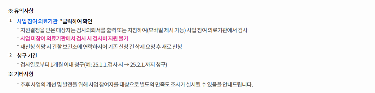 - 사업 미참여 의료기관에서 검사 시 검사비 지원 불가 합니다.
