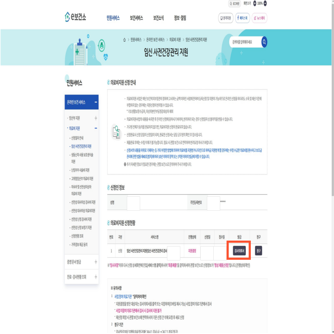 - 신청이 끝나고 잠시 후 <임신 사전건강관리 지원> 탭에 들어가 보면 진행상태에 지원결정이라고 표기되며 검사의뢰서를 발급받을 수 있습니다. 검사받고자 하는 사업참여 의료기관에 방문하여 검사의뢰서를 제시하고 검사를 받은 뒤 사후 비용을 청구하시면 됩니다.