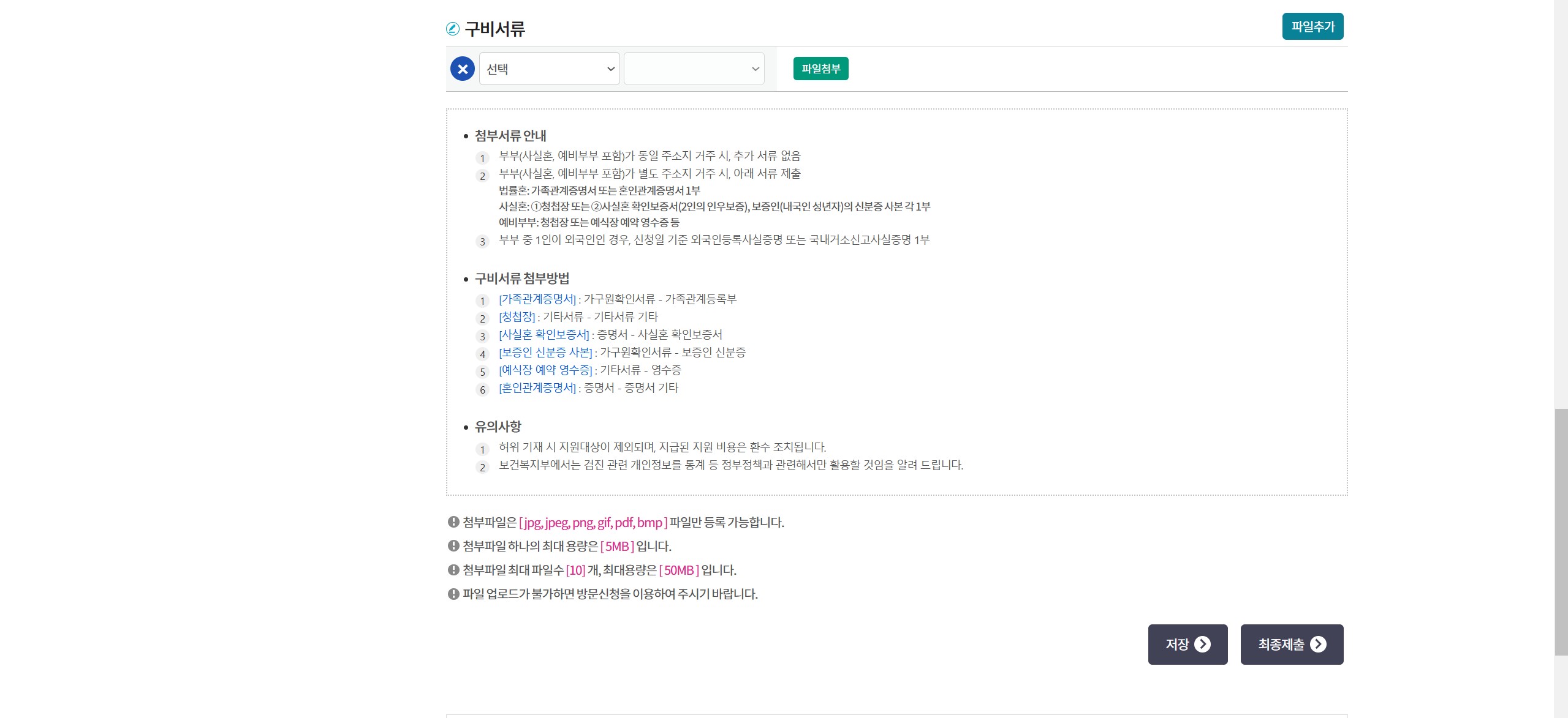- 본인 인증이 끝나면 개인 정보를 확인하고 구비서류를 첨부합니다. 첨부가 모두 끝났으면 마지막으로 최종 제출 버튼을 눌러줍니다.