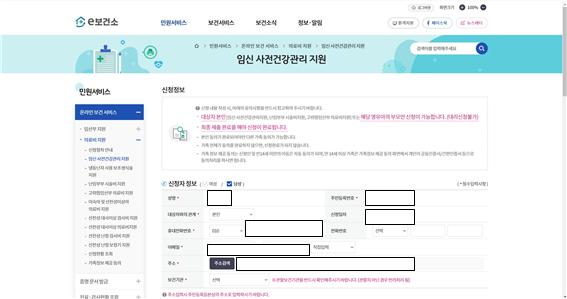 - e보건소(https://www.e-health.go.kr) 메인화면입니다. 민원서비스탭에서 임신 사전건강관리 지원을 선택합니다.
