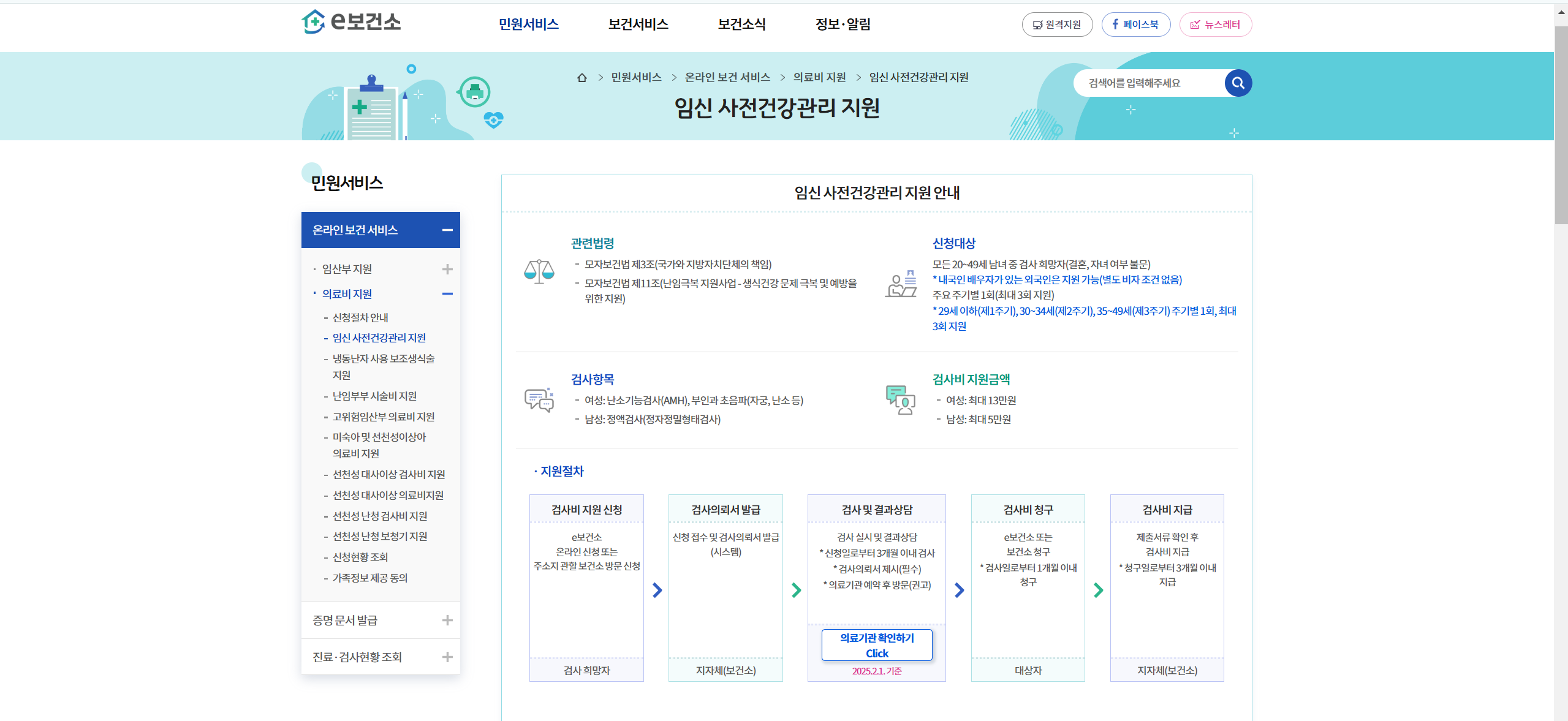 - 임신 사전건강관리 지원 안내 화면이 나오면서 신청대상, 검사 항목, 지원절차 설명 페이지가 나옵니다. 스크롤바를 아래로 쭉 내립니다.