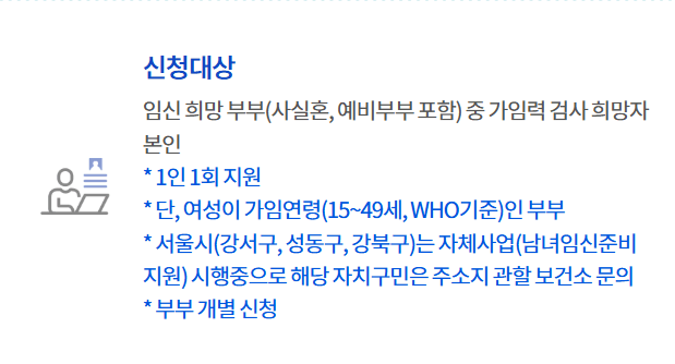 , 부부 중 여성이 가임연령(15~49, WHO기준)인 경우에 한하여 지원