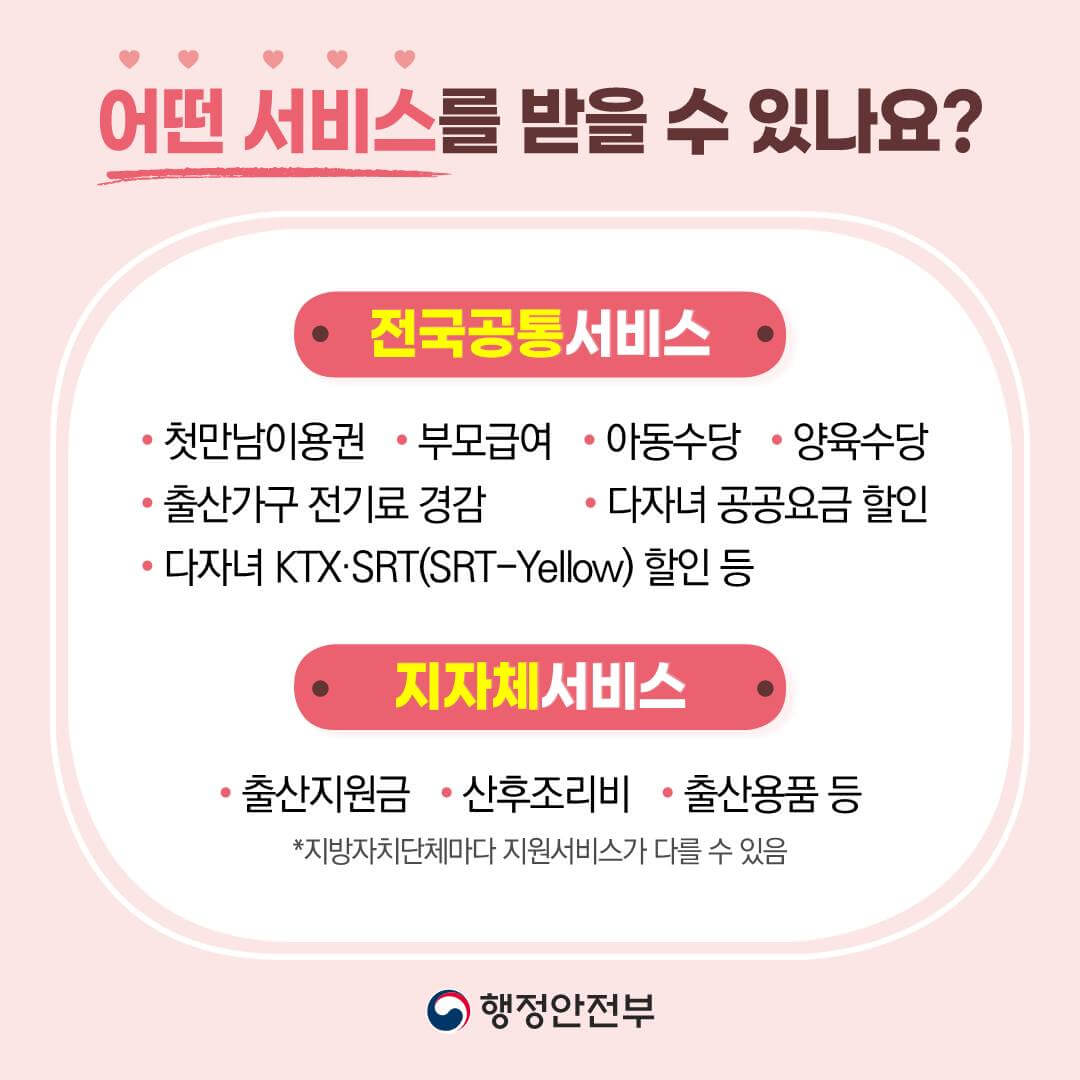 첫 만남 이용권, 부모급여, 아동수당, 양육수당, 출산가구 전기료 경감, 다자녀 공공요금 할인, 다자녀 KTX·SRT(SRT-Yellow) 할인 등