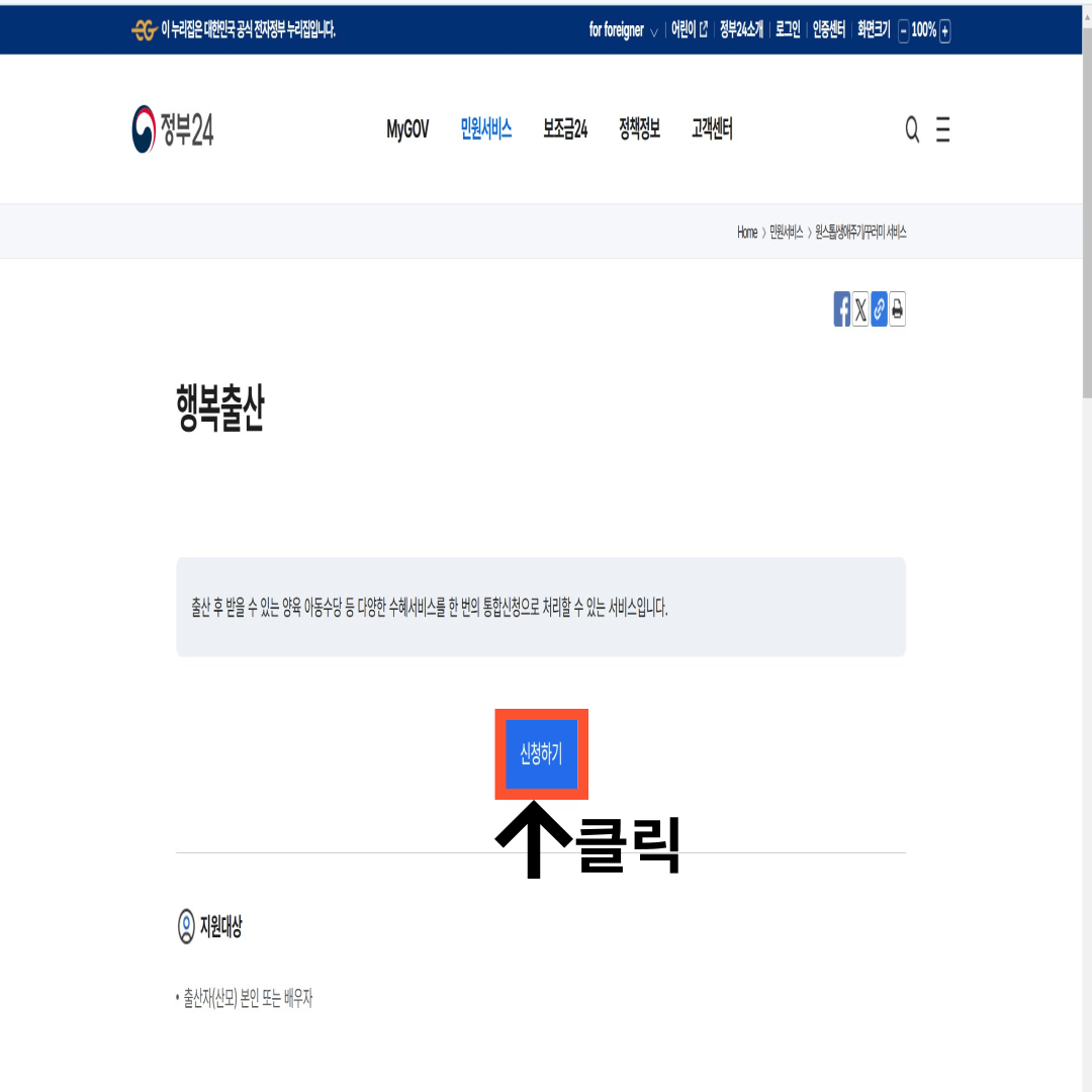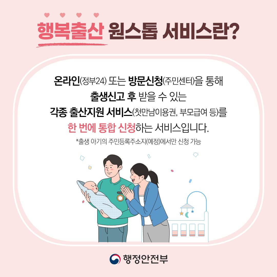 온라인(정부24) 또는 주민센터에 방문하여 출생 신고 후 받을 수 있는 각종 출산 지원 서비스를 한 번에 통합 신청하는 서비스입니다