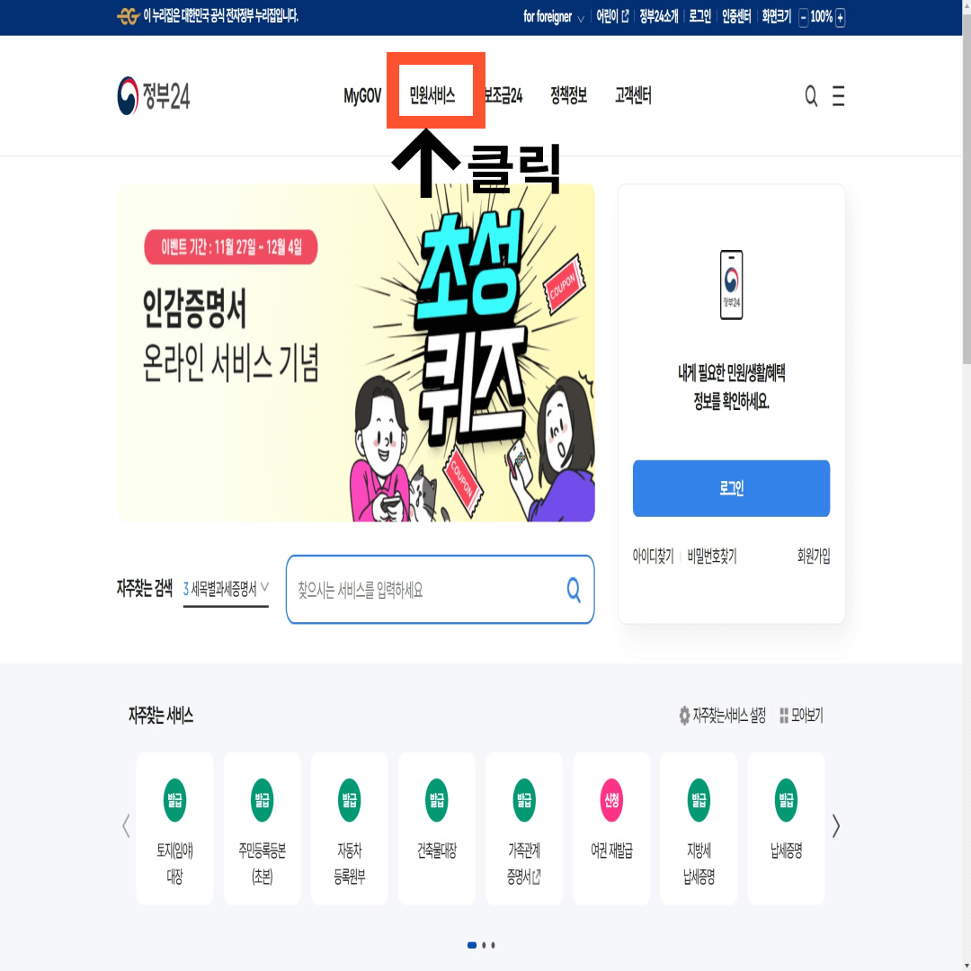 정부24에 접속하고 민원서비스를 클릭합니다.
