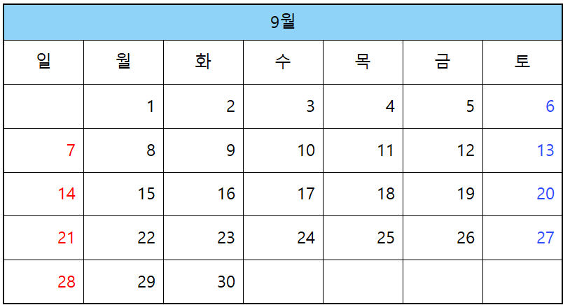 9월은 다가올 10월을 위해 준비하는 기간으로 공휴일이 없습니다. 10월을 기대해 주시기 바랍니다.