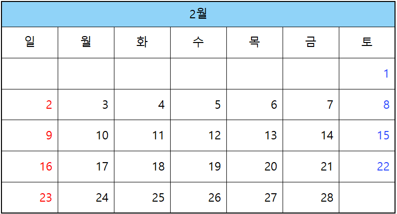 2월달은 공휴일이 없지만 3월 1일(토) ~ 3월 3일(월)까지의 연휴가 기다리고 있습니다. 이에 따라 2월 28일(금)에 연차를 낸다면 최대 4일을 쉴 수가 있으니 일정에 참고하시기 바랍니다.