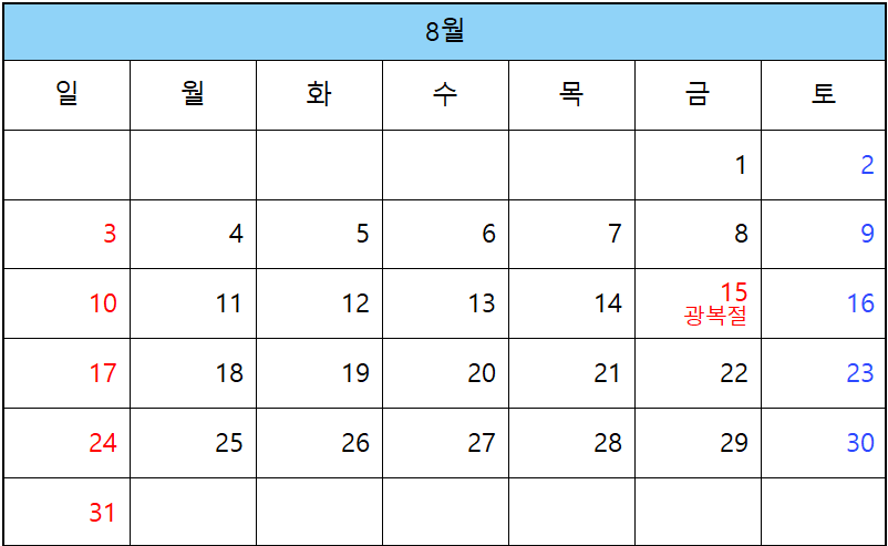 7월달은 열심히 일을 해야 하는 달입니다. 아쉽지만 공휴일이 없으므로 바로 8월로 넘어가겠습니다.