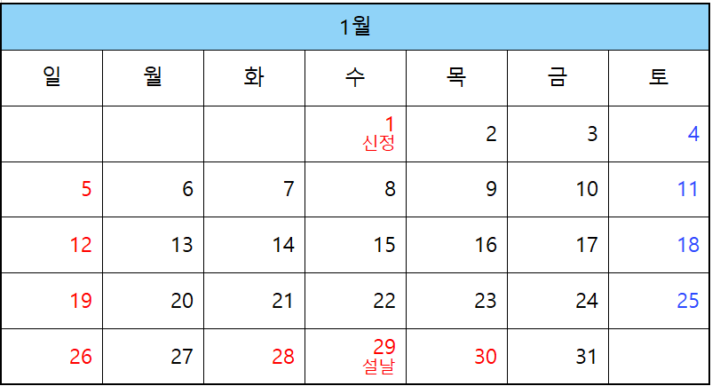 1월 28일(화) ~ 1월 30일(목)은 설 연휴기간입니다. 1월 27일 월요일과 1월 31일 금요일에 연차를 사용한다면 최대 9일 간의 연휴를 보내실 수 있습니다. 오랜만에 만나는 가족들과 의미깊은 시간 보내시길 바라겠습니다.