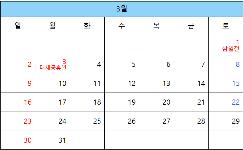3월달에는 앞서 언급했듯이 3월 1일(토) ~ 3월 3일(월)까지 연휴기간이 찾아옵니다. 3월 3일이 대체 공휴일이기 때문인데 2월 28일(금) 연차를 놓치신 분들께는 3월 4일(화)에 휴가를 내는 것을 추천드립니다.