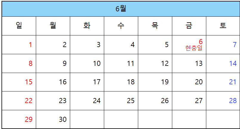 6월 6일(금)은 현충일입니다. 6월 5일(목) 혹은 6월 9(월)에 휴가를 낸다면 4일간의 연휴를 맞이할 수 있습니다. (6월은 호국보훈의 달입니다. 국가를 위해 헌신한 호국영령들께 깊은 추모와 경의를 표합니다.)