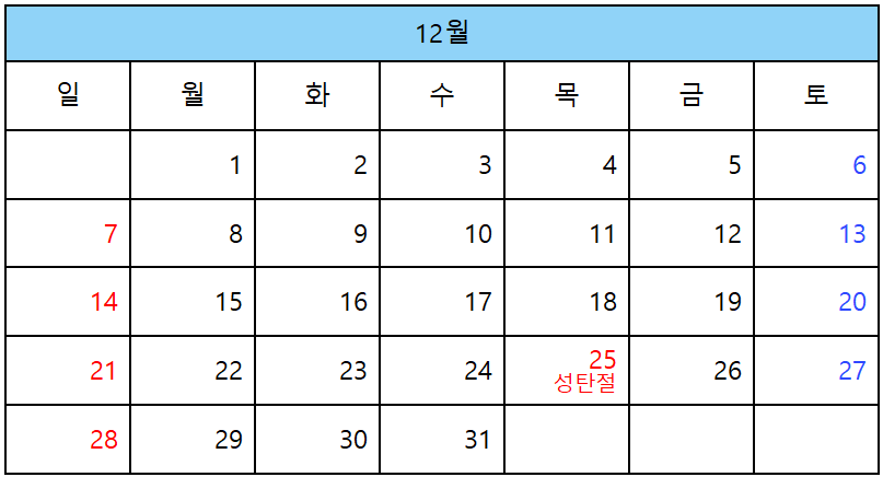 11월에는 공휴일이 없으므로 바로 12월로 넘어가겠습니다.